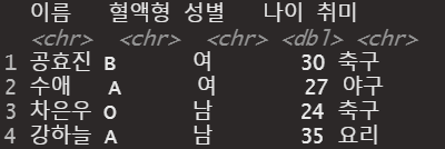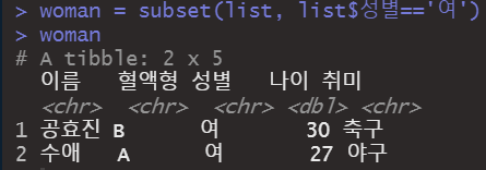 -subset(list, list$성별=='여') 함수를 woman이라는 변수에 저장한다.